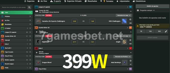 O 399W oferece uma grande seleção de opções de apostas em e-sports com probabilidades competitivas